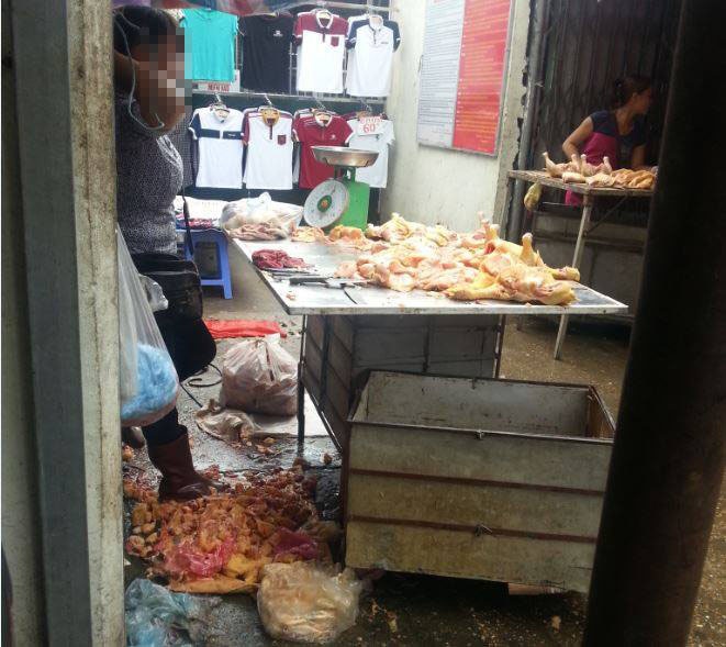 Hầu hết gà tồn lại dưới dạng miếng nhỏ, có màu trắng nhợt, hoặc thâm đen. Theo chị T., do tuốt lông bằng máy công nghiệp khiến đầu cổ gà thường bị dập, hoặc một số miếng thịt có màu thâm rất khó bán. Những gà vụn, thải loại được vứt ngay dưới chân người bán hàng. Quan sát sau khi lượng thịt trên quầy bán vơi dần, người này bới ở đống gà thải lấy đầu cổ, da gà để lại lên quầy bán thêm.