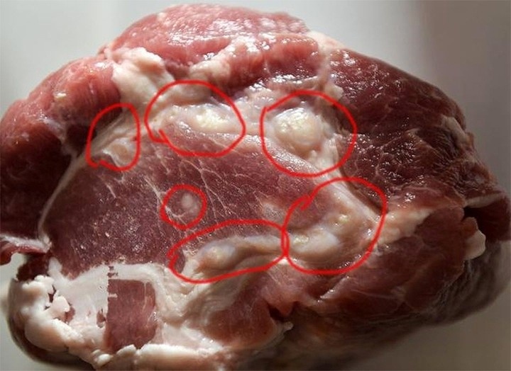 Nếu trong quá trình chọn lựa thực phẩm, quan sát thấy những hạt nhỏ li ti, màu trắng đục, hình bầu dục giống như hạt gạo ẩn hiện bên trong thớ thịt hoặc các mô mỡ, thì đây chính là dấu hiệu điển hình của nang sán lợn. Không nên mua hoặc sử dụng loại thịt này để chế biến món ăn, kể cả khi đã nấu chín kỹ ở nhiệt độ cao, vẫn có nguy cơ bị lây nhiễm sán.
