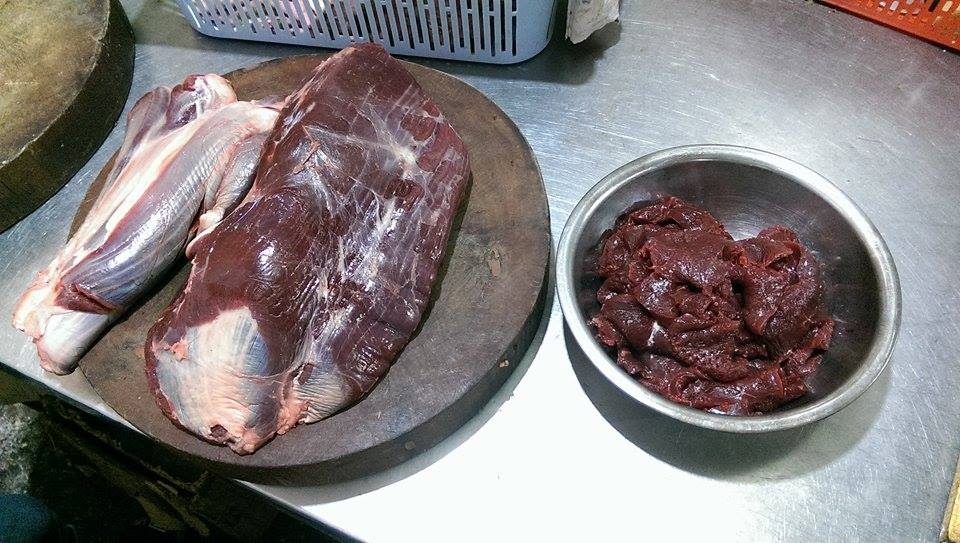 | Thịt trâu màu đỏ đậm, thẫm mầu và có thớ thịt to hơn bò. Ảnh: Ngọc Lan. |