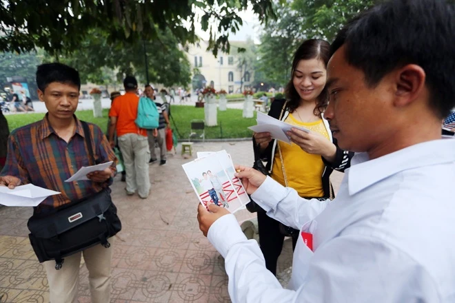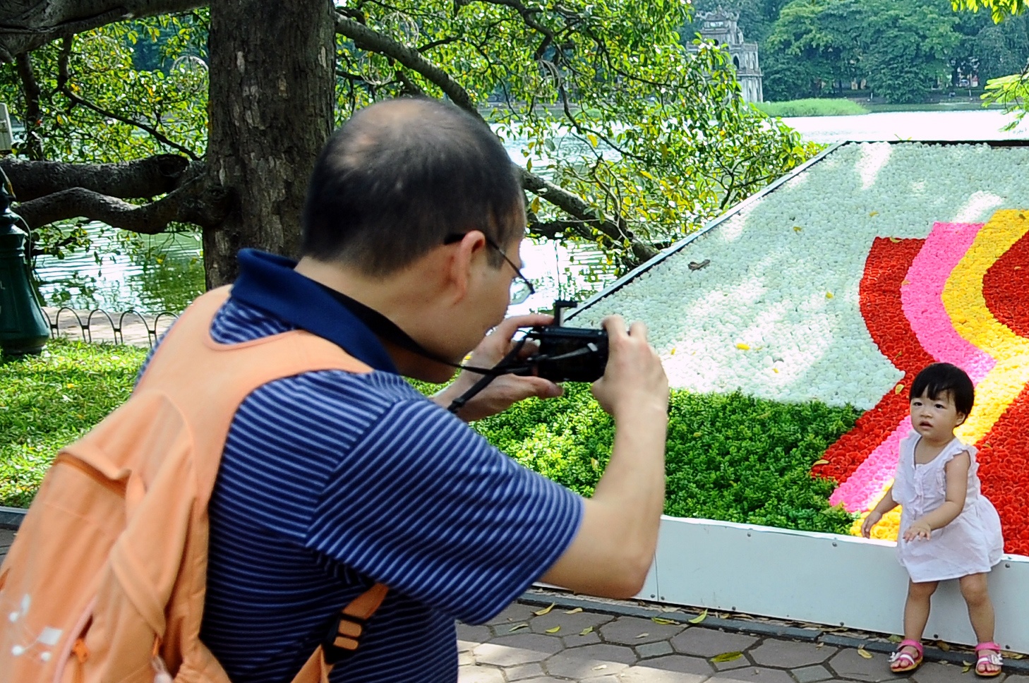 Hai bố con người khách du lịch đi chơi hồ Gươm đem theo máy ảnh tự chụp.