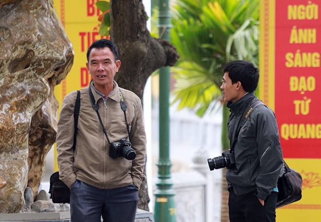 Anh Đức (phải) một người chụp ảnh lâu năm tại công viên Thủ Lệ cho biết, tại đây có hơn 100 người chụp ảnh, mỗi tháng đóng thuế 1 triệu đồng cho phòng kinh doanh của công viên. "Đất chật, người thì nhiều, ấy vậy mà ai cũng thi nhau vào chụp ảnh, có ngày ế ẩm không ai nhờ chụp, mời rơi răng ra", anh Đức tâm sự.
