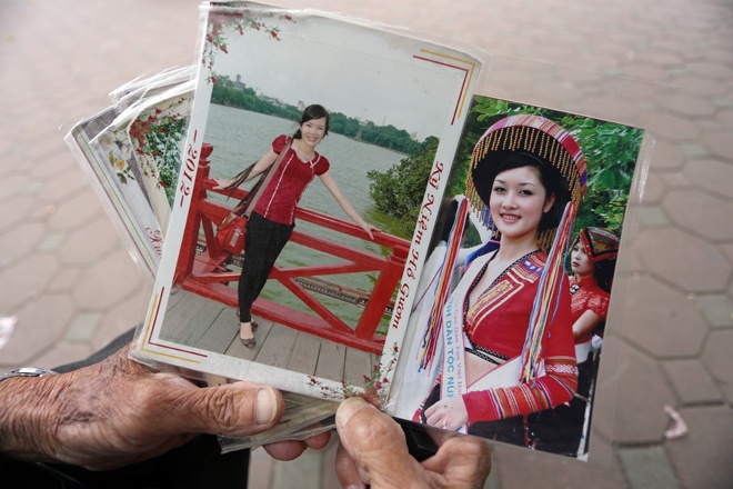 Trong ảnh là anh Thành. Anh nhiều lúc phải đi vòng quanh bờ Hồ để mời chào khách. Anh kể, nhiều bạn trẻ thuê chụp xong không rửa ảnh mà chỉ copy file từ máy ảnh. Mỗi lần copy file cả mấy chục kiểu anh cũng chỉ lấy tiền bằng công một kiểu ảnh.