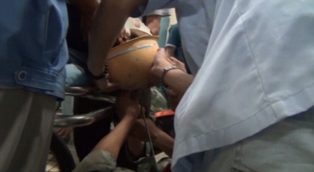 Ngay lập tức, mọi người đưa anh tới bệnh viện để cấp cứu. Tại đây, các bác sĩ cùng lính cứu hỏa cắt một phần thanh sắt, tháo bỏ mũ bảo hiểm rồi đưa nạn nhân lên bàn phẫu thuật.