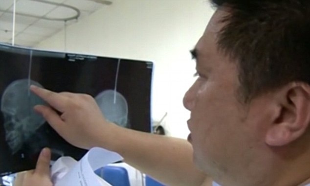 | Theo ảnh chụp X-quang, thanh sắt đã đâm sâu vào đầu nạn nhân khoảng 5 cm. |