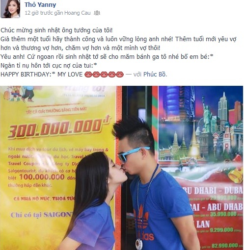 Trước đây, trên mạng xã hội, cặp đôi này đã từng công khai tình yêu. Vào ngày sinh nhật của Phúc Bồ, Thỏ Yanny viết: “Chúc mừng sinh nhật ông tướng của tôi. Già thêm một tuổi hãy thành công và luôn vững lòng anh nhé, thêm tuổi mới yêu vợ hơn và thương vợ hơn, chăm vợ hơn và một mình vợ thôi. Yêu anh, cứ ngoan rồi sinh nhật tớ sẽ cho măm bánh ga tô nhé bố em bé. Ngàn tỷ nụ hôn tới cục nợ của tui".