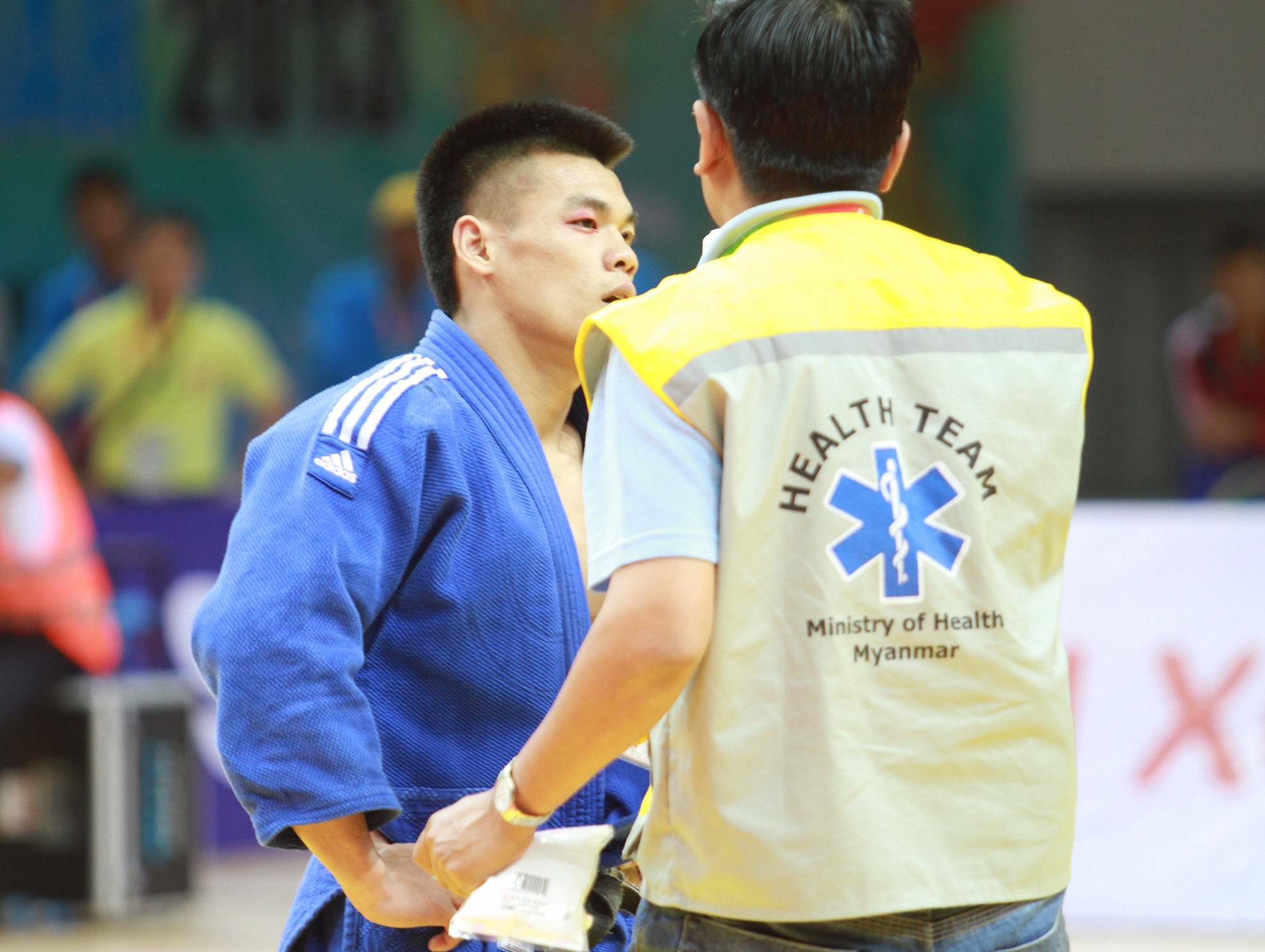 | Khi trận bán kết hạng cân dưới 66kg môn judo vừa diễn ra được vài giây, Nguyễn Đình Lộc đã bị VĐV Machammad Syaiful Raharjo của Indonesia chọc vào mắt, chảy máu. |