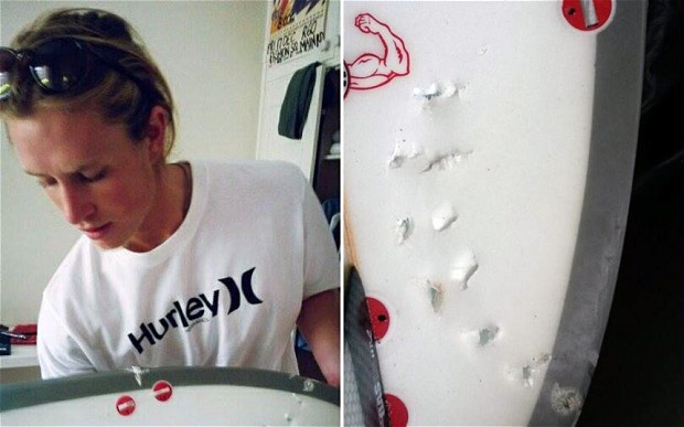Bất ngờ, con cá mập trắng dài khoảng 3 đến 4 m vọt lên khỏi mặt nước và va vào ván của Thomas khiến ván nghiêng 90 độ.