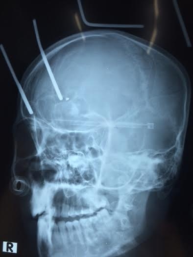 | Hình ảnh chụp Xquang cho thấy hai thanh sắt đâm sâu vào não bộ của anh Tú. |