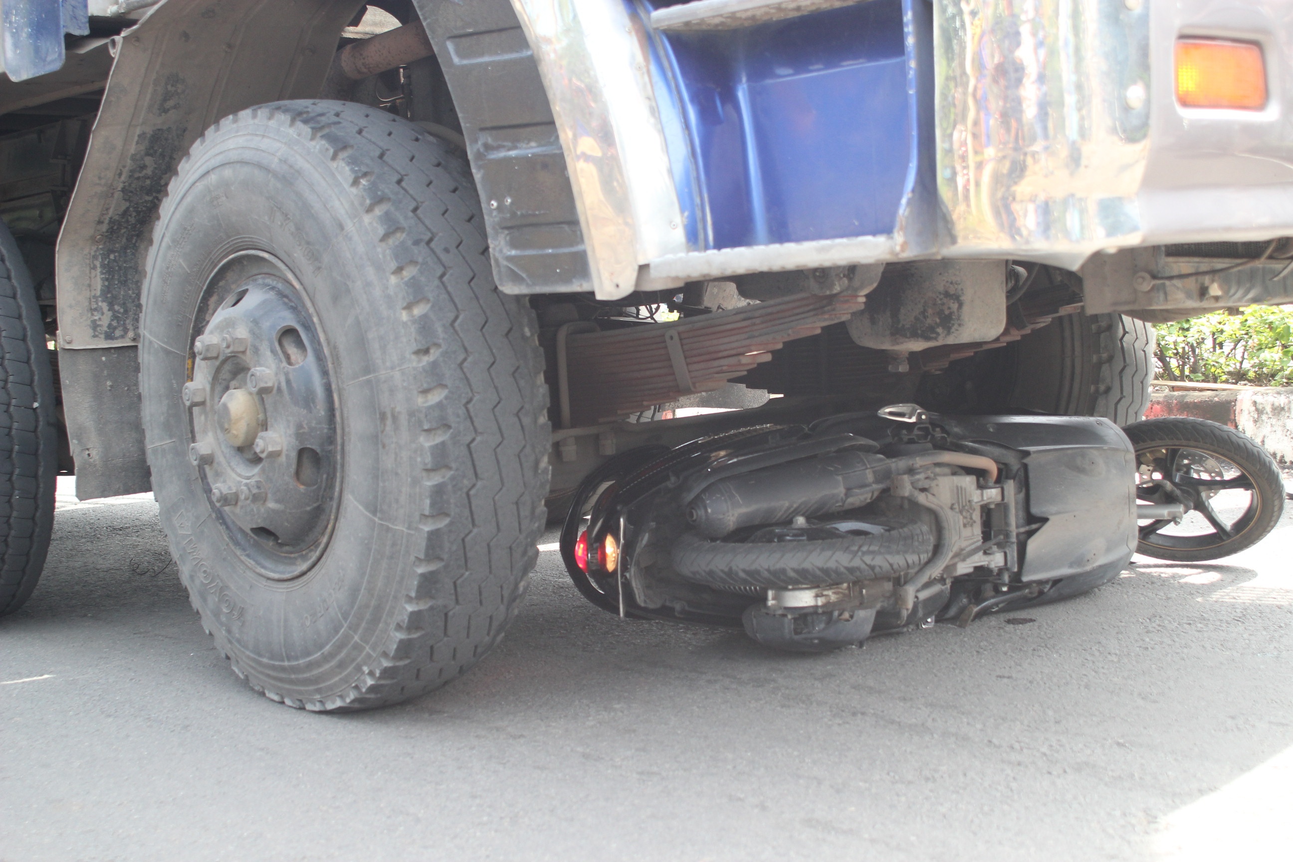 | Chiếc xe máy lọt thỏm trong gầm xe tải. |
