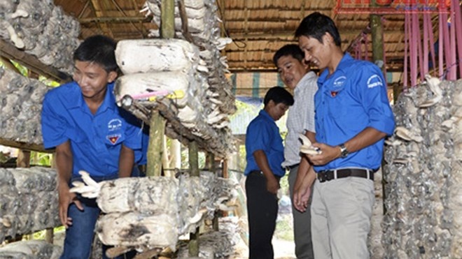 | Đoàn viên, thanh niên tham quan mô hình trồng nấm của anh Luận. |