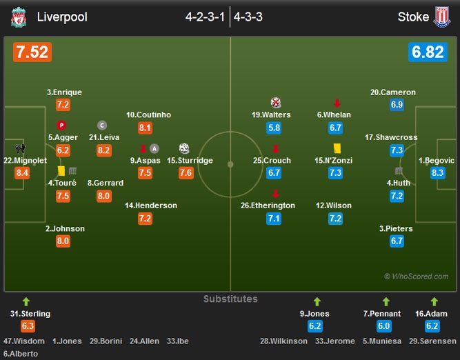 | Đội hình ra sân của Liverpool và Stoke. |
