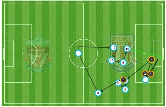 Sau khi để Stoke có tình huống tấn công nguy hiểm ở phút thứ 8 khi đưa bóng trúng xà ngang, Liverpool nhanh chóng triển khai lối chơi và làm chủ thế trận trên sân. Phút 10, Daniel Sturridge đưa bóng vào lưới của Stoke, nhưng đáng tiếc là tiền đạo người Anh lại dứt điểm ở vào thế việt vị.