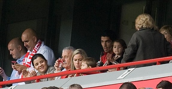 | Luis Suarez theo dõi đồng đội thi đấu từ trên khán đài sân Anfield. |
