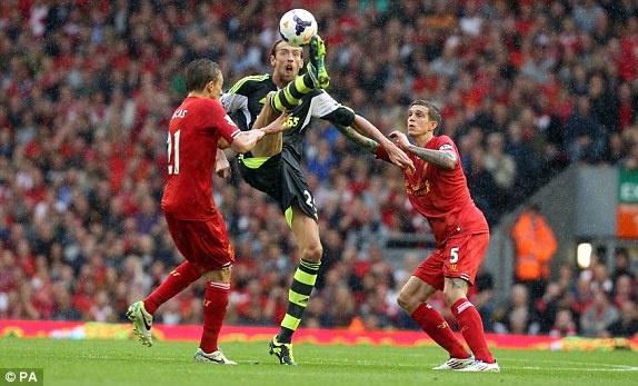 | Petr Crouch tranh bóng với hai cầu thủ của Liverpool. |