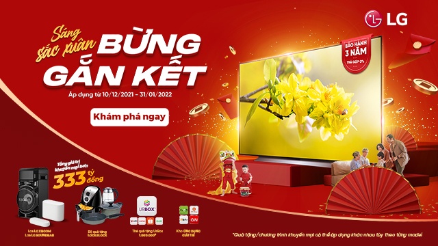 Dịp này, LG triển khai chương trình “Sáng sắc Xuân - Bừng gắn kết cùng TV LG” với tổng khuyến mại hơn 333 tỷ đồng. Chương trình áp dụng từ nay đến hết ngày 31/1/2022. Theo đó, khi mua TV của LG, khách hàng có cơ hội nhận loa Karaoke RN5 trị giá 7,59 triệu đồng, bộ quà tặng Lock&Lock, thẻ quà tặng Urbox cùng gói dịch vụ giải trí.