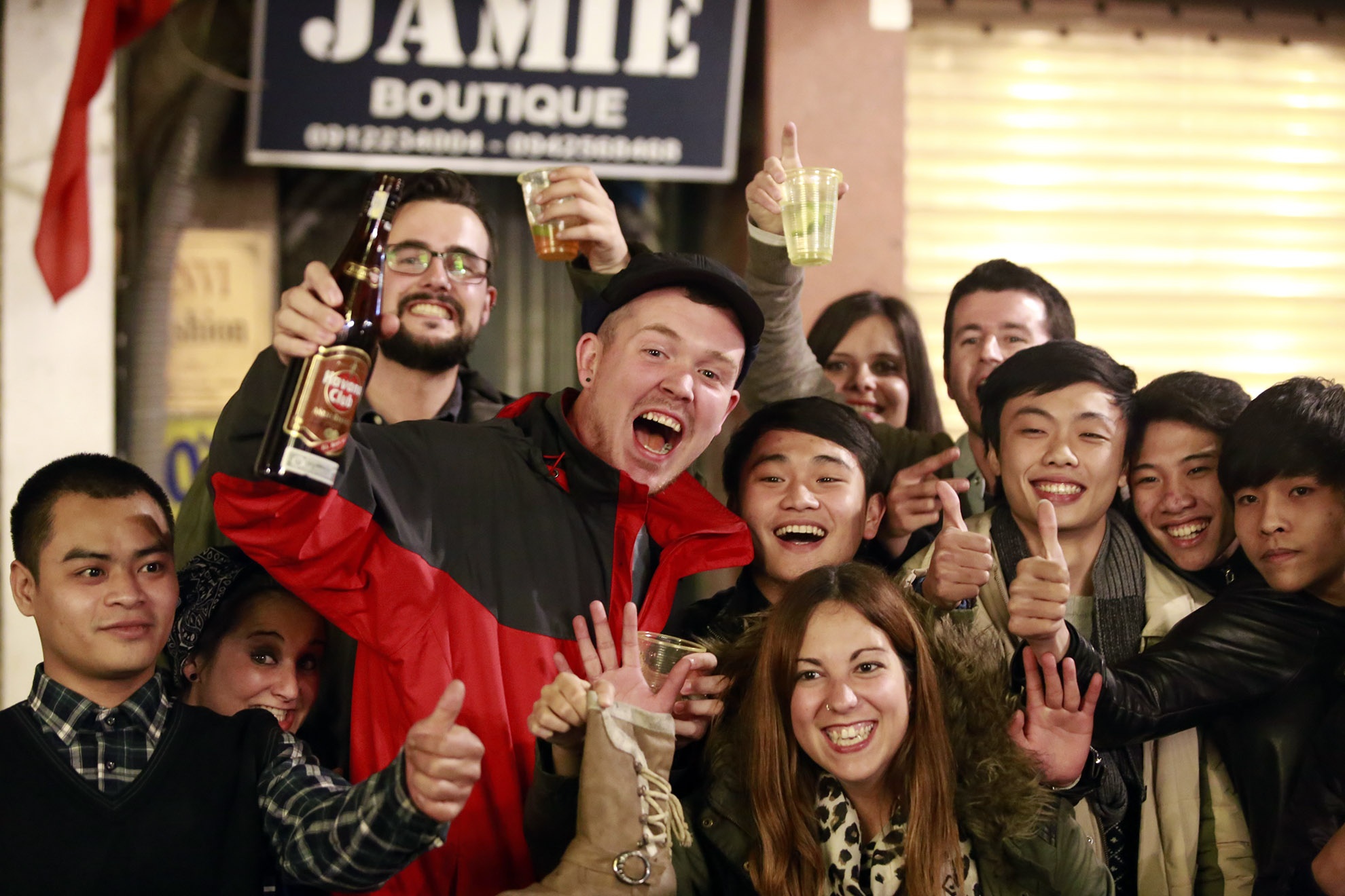 | Người nước ngoài bật đồ uống chia sẻ niềm vui cùng giới trẻ Việt Nam ngoài đường phố. Ảnh: Lê Hiếu. |