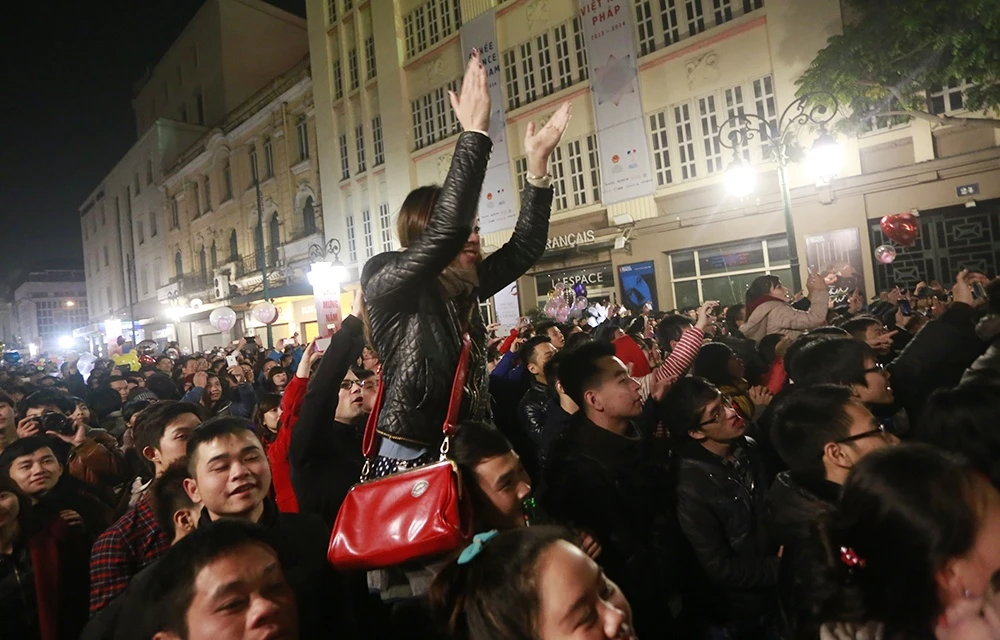 | Giữa rừng người ở khu vực Nhà hát Lớn (Hà Nội), khi chiếc đồng hồ đếm ngược bắt đầu hoạt động khi chỉ còn 60 giây là bước sang năm mới, tất cả như nín thở ôm lấy nhau chờ đợi. Ảnh: Lê Hiếu. |