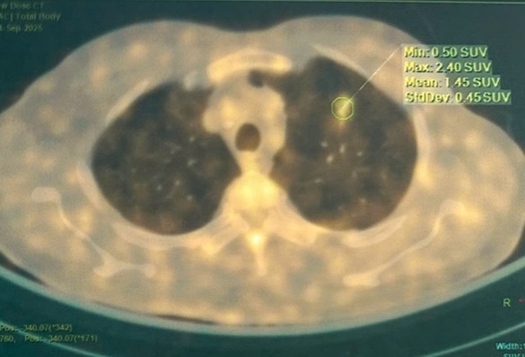 Trong quá trình kiểm tra, bệnh nhân được chụp CT ngực và tình cờ phát hiện một tổn thương dạng kính mờ ở thùy trên phổi trái. Người bệnh sau đó được chuyển đến Trung tâm Y học hạt nhân và Ung bướu để đánh giá chuyên sâu.
