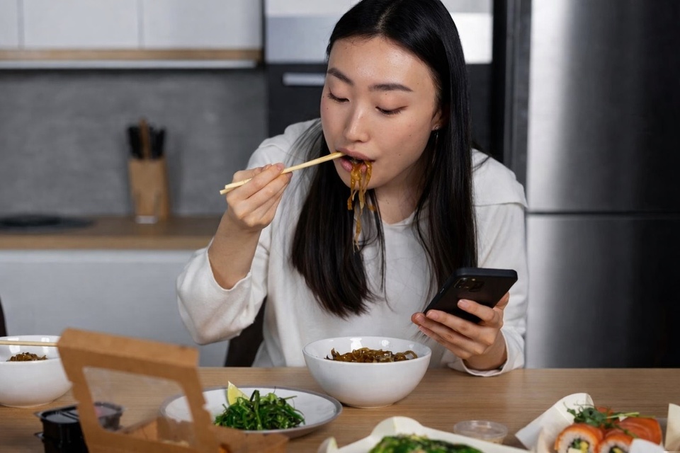 Tranh thủ lướt điện thoại khi ăn uống là thói quen phổ biến của giới trẻ thời hiện đại. Ảnh: Freepik. |