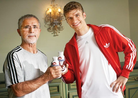 | Thomas Mueller và huyền thoại Gerd Mueller quảng cáo sữa. |