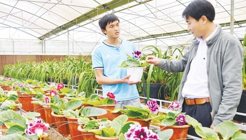 Kỹ sư Nguyễn Văn Hoàng (trái) giới thiệu giống hoa chuông tình yêu. |