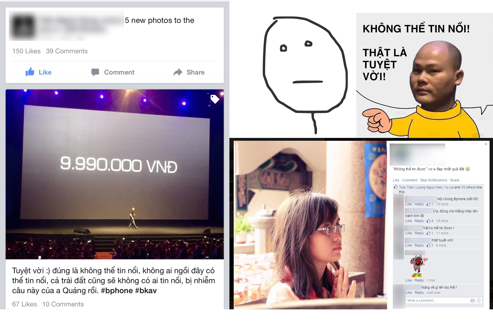 | Cộng đồng mạng Việt Nam hài hước chế ảnh và sử dụng lại câu nói "thật là tuyệt vời", "không thể tin nổi" của CEO Bkav ở khắp mọi nơi. |