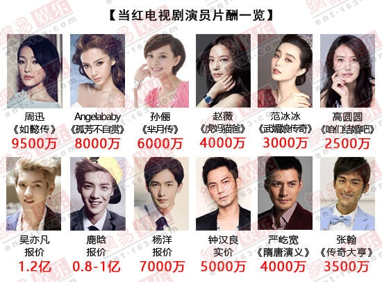 Xếp sau cô là Angelababy với 80 triệu NDT. Tôn Lệ với Mị Nguyệt truyện được trả 60 triệu NDT. Những vị trí tiếp theo thuộc về Triệu Vy (40 triệu NDT), Phạm Băng Băng (30 triệu NDT) và Cao Viên Viên (25 triệu NDT).