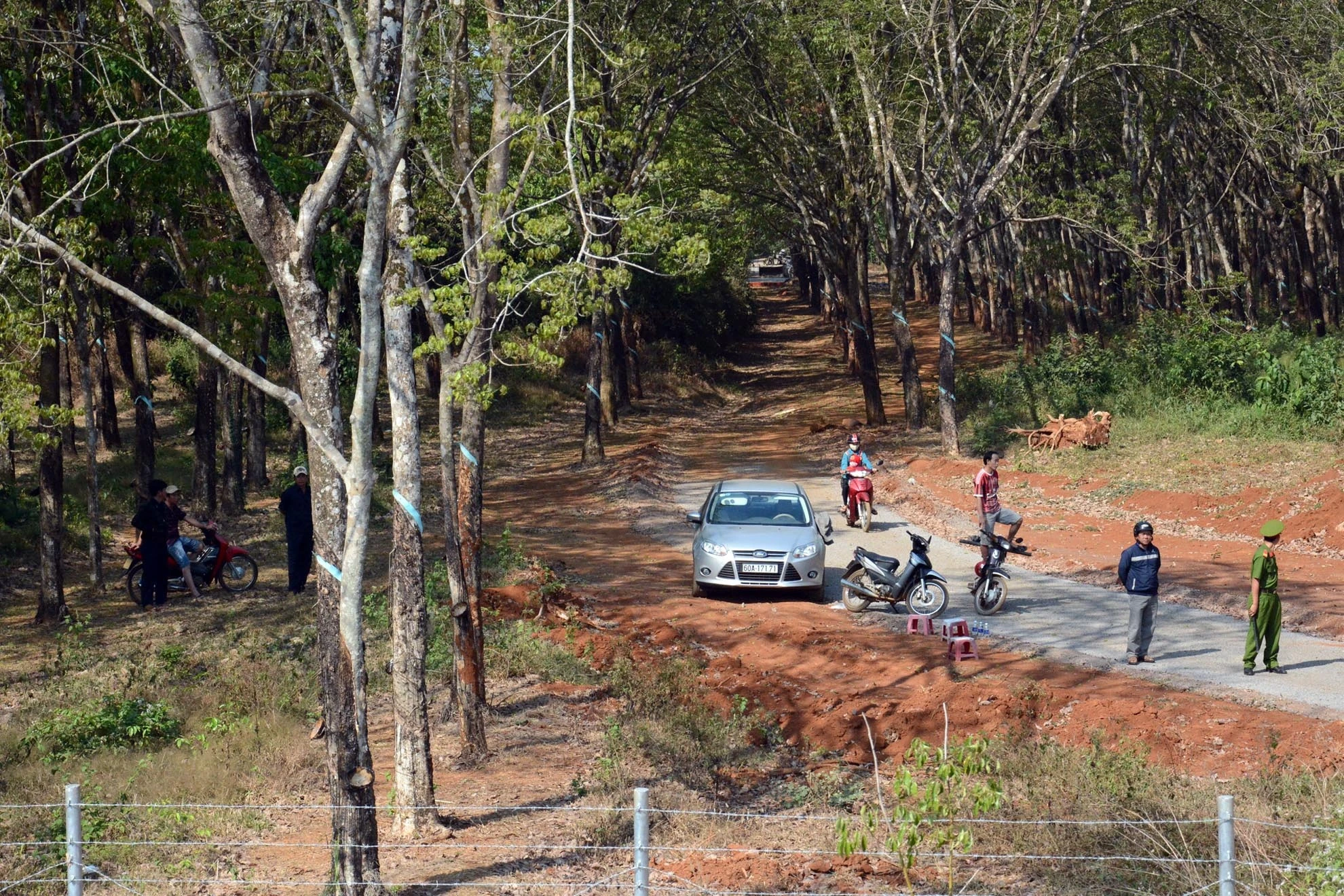 | Suốt dọc hai bên tuyến cao tốc dựng hàng rào thép gai, mắt cao để ngăn cách rừng cao su, khu vực sản xuất nông nghiệp, khu dân cư. Người dân địa phương, công nhân nông trường cao su theo dõi lễ thông xe từ trong rừng cao su. |