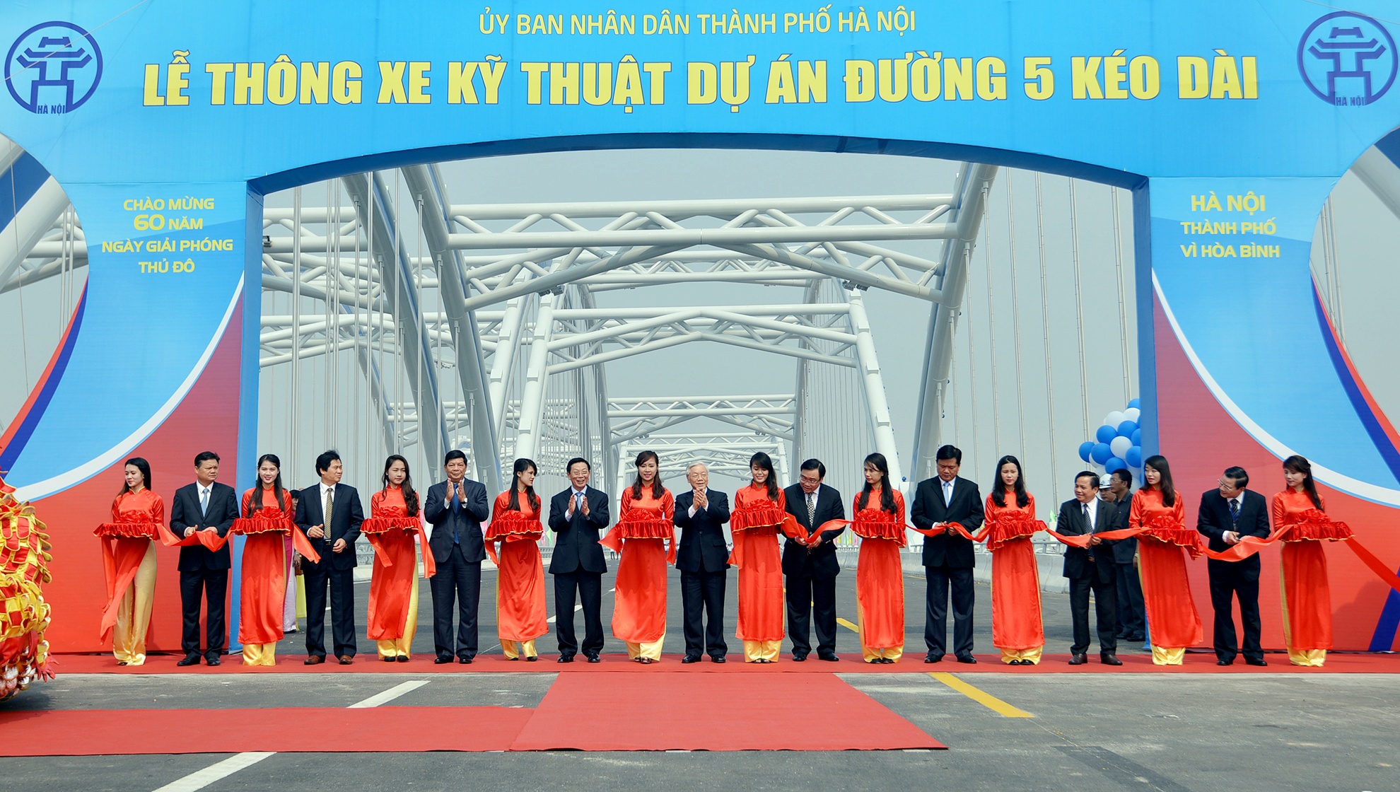 | Đến dự lễ có Tổng bí thư Nguyễn Phú Trọng cùng các lãnh đạo cơ quan Đảng và Nhà nước. Cây cầu ược áp dụng công nghệ mới, hoàn toàn do các kiến trúc sư, kỹ sư của Việt Nam hoàn thiện, làm chủ công nghệ. |