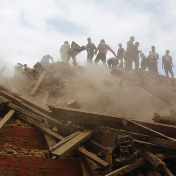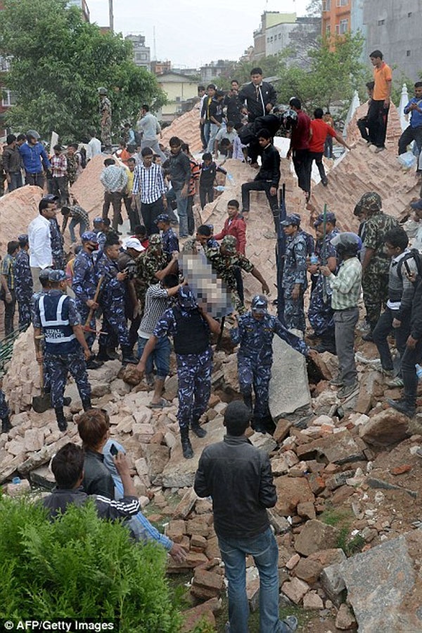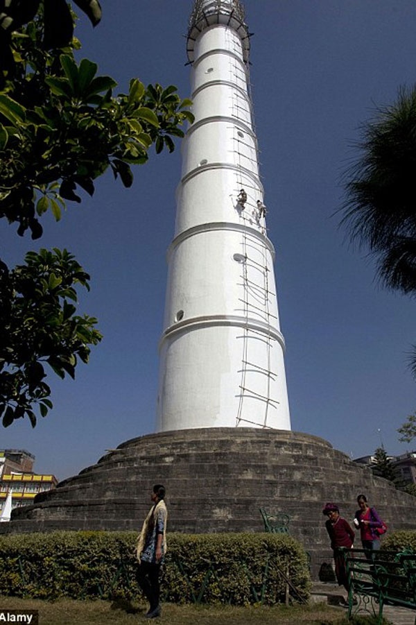 | Tòa tháp lịch sử Dharahara tại thủ đô Kathmandu trở thành đống đổ nát sau cơn địa chấn. Ít nhất 50 người bị chôn vùi dưới lớp gạch đá của công trình này. Lực lượng cứu hộ đang nỗ lực tìm kiếm nạn nhân. Công trình cao gần 63 m, cho phép du khách ngắm nhìn toàn bộ thành phố. Nó được xây dựng năm 1983. Ảnh: Alamy/Getty |
