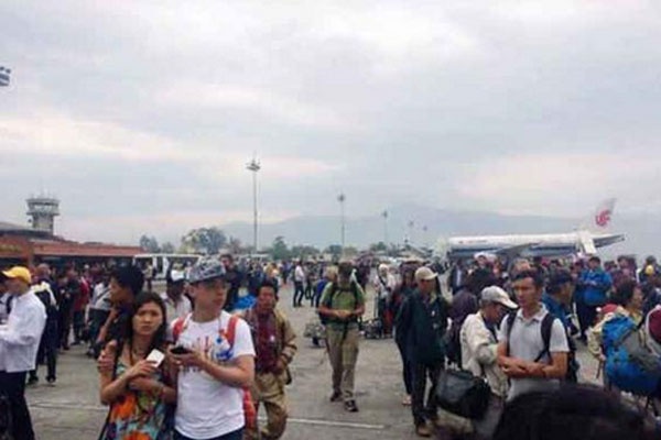 | Hành khách tại sân bay quốc tế ở Kathmandu hoảng loạn sau khi thiên tai ập tới. Theo giới chức Ấn Độ, ít nhất 200 công dân nước này thiệt mạng trong thảm kịch. Ảnh: Wiki/Reuters |