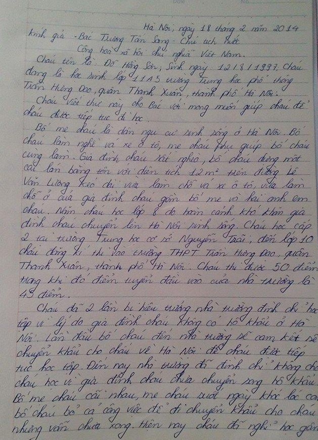Không có hộ khẩu Hà Nội, em Đỗ Hồng Sơn, sinh năm 1997, học sinh lớp 11A5 trường THPT Trần Hưng Đạo (Thanh Xuân, Hà Nội) bị nhà trường buộc thôi học. Trong bức thư đề gửi Chủ tịch nước Trương Tấn Sang ngày 18/2, học sinh này có nguyện vọng đi học trở lại. Sau đây là nguyên văn bức thư của Sơn: