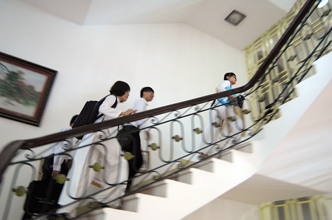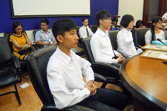 | Sáng nay 2 thủ khoa Nguyễn Hữu Tiến và thủ khoa Lê Xuân Hoàng (thủ khoa kép ĐH Y Hà Nội và ĐH Thủy Lơi) có mặt từ rất sớm và ngồi cạnh nhau. |
