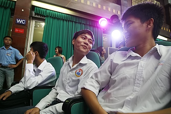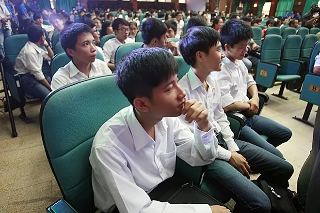 | Cả hai và bạn bè lên hội trường để nghe Bộ trưởng Bộ y tế Nguyễn Thị Kim Tiến trò chuyện. |