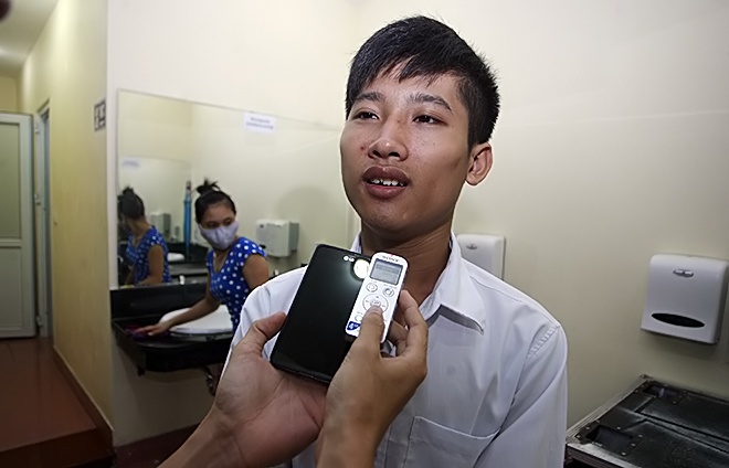 | Tiến được báo chí "chăm sóc" trong buổi sáng 4/9. Bố của Tiến, ông Nguyễn Hữu Định đã chấp nhận cuộc sống màn trời chiếu đất ở Hà Nội suốt 10 năm để dành dụm gửi tiền về nuôi con. |