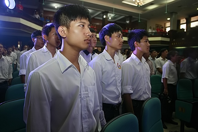 | Tiến khá ưu tư trong buổi khai giảng sáng nay. Cậu học trò quê Ứng Hòa (Hà Nội) thi đỗ ĐH Y Hà Nội với số điểm 29,5. Cậu em song sinh với Tiến là Nguyễn Hữu Tiền cũng thi đỗ vào ĐH Bách khoa Hà Nội. |
