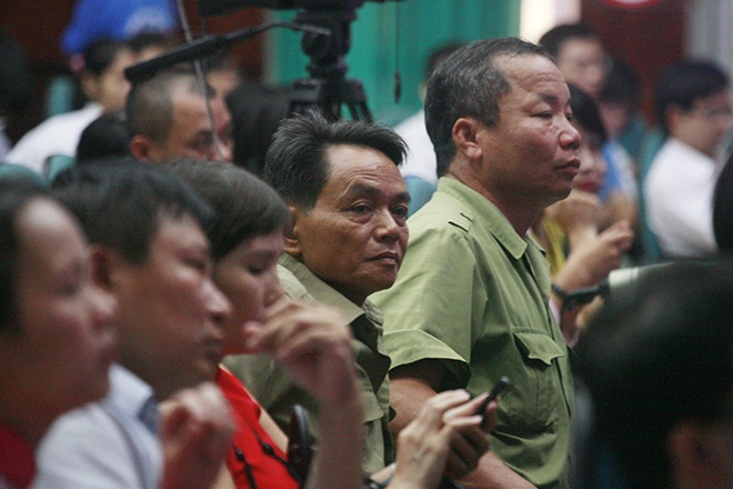 | Bố thủ khoa Lê Xuân Hoàng (áo ghi bên trái) lặn lội từ Thanh Hóa ra Hà Nội để dự lễ khai giảng cùng con. |