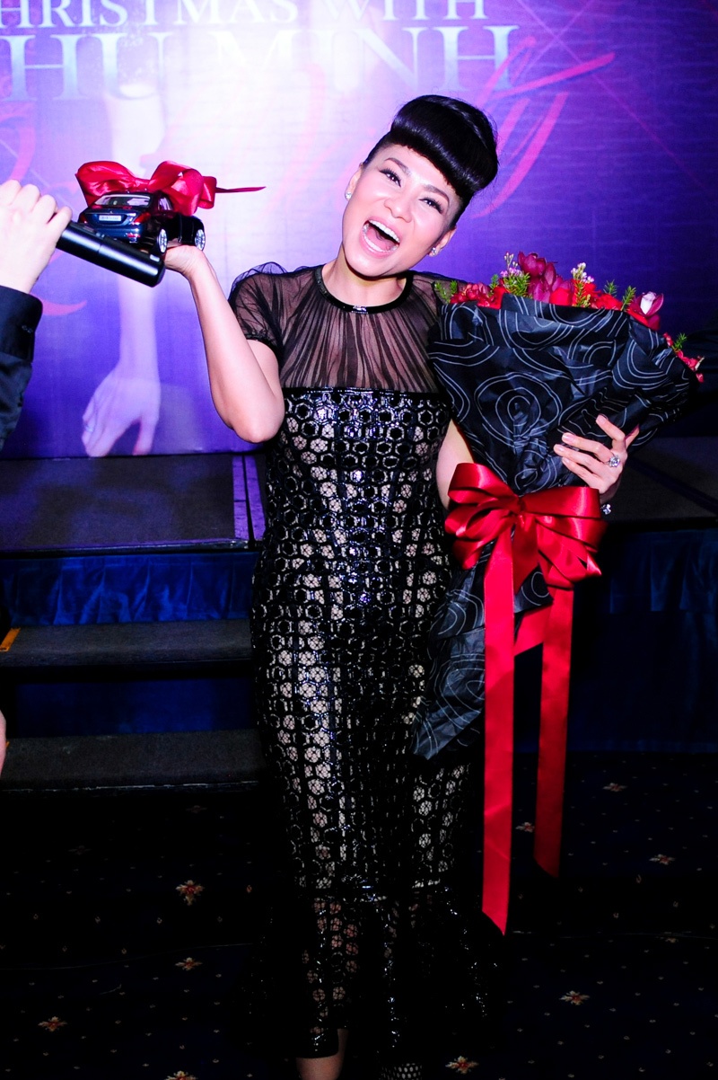 | Sau khi trao xe "thật" dưới sảnh tiệc, trong bữa tiệc, ông xã của nữ ca sĩ mời đại diện thương hiệu lên trao xe dưới dạng mô hình. Thu Minh đùa rằng, hàng năm cô sẽ cố gắng tổ chức đêm tiệc Noel để nhận quà từ chồng. |