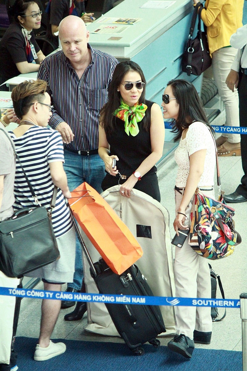 | Vợ chồng Thu Minh được tài xế đưa ra sân bay. Nữ ca sĩ đi khá vội vàng vào khu vực check-in hành lý. Trong khi đó, ông xã của cô khệ nệ xách đồ, trang phục biểu diễn cho vợ. |