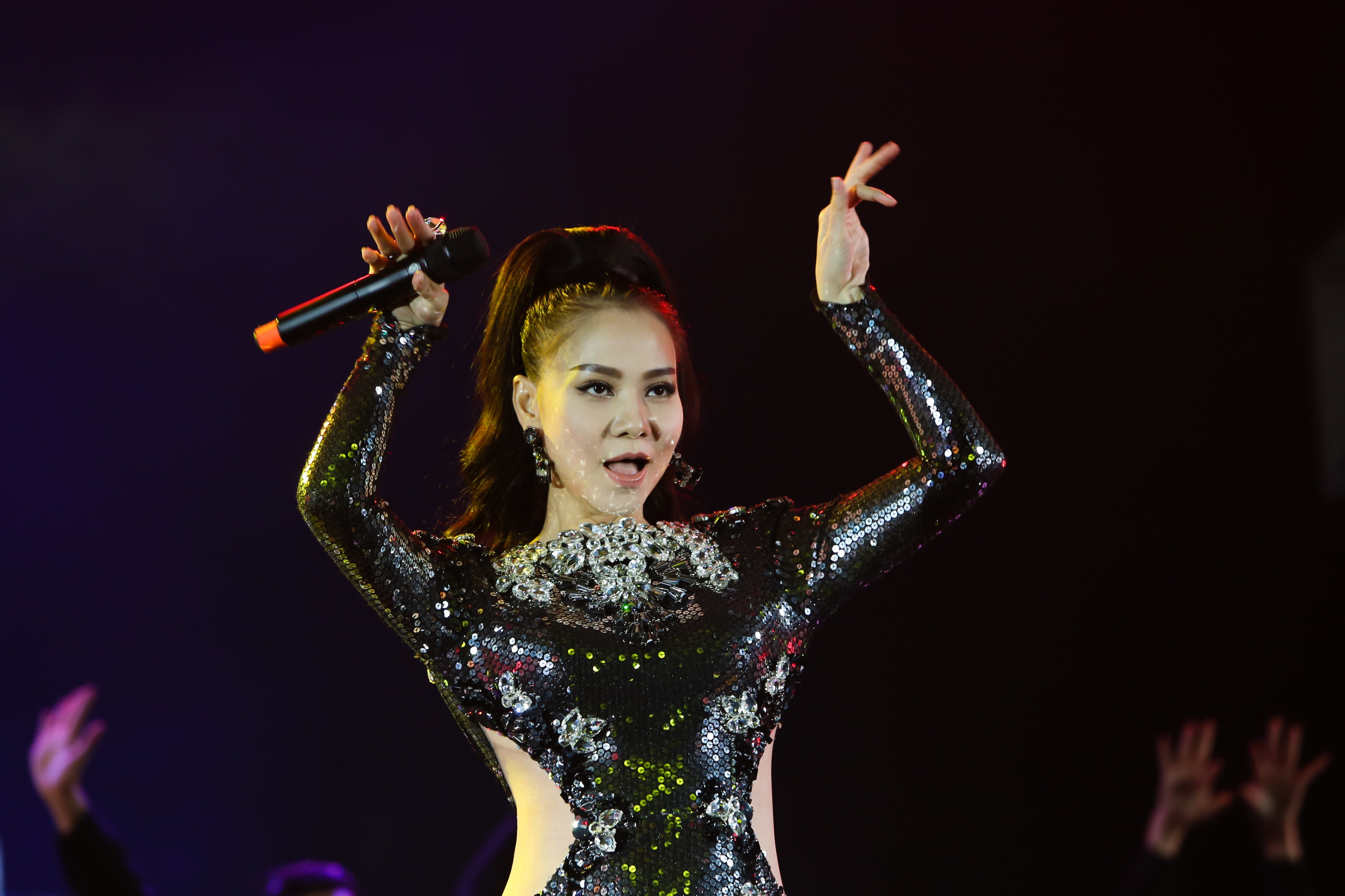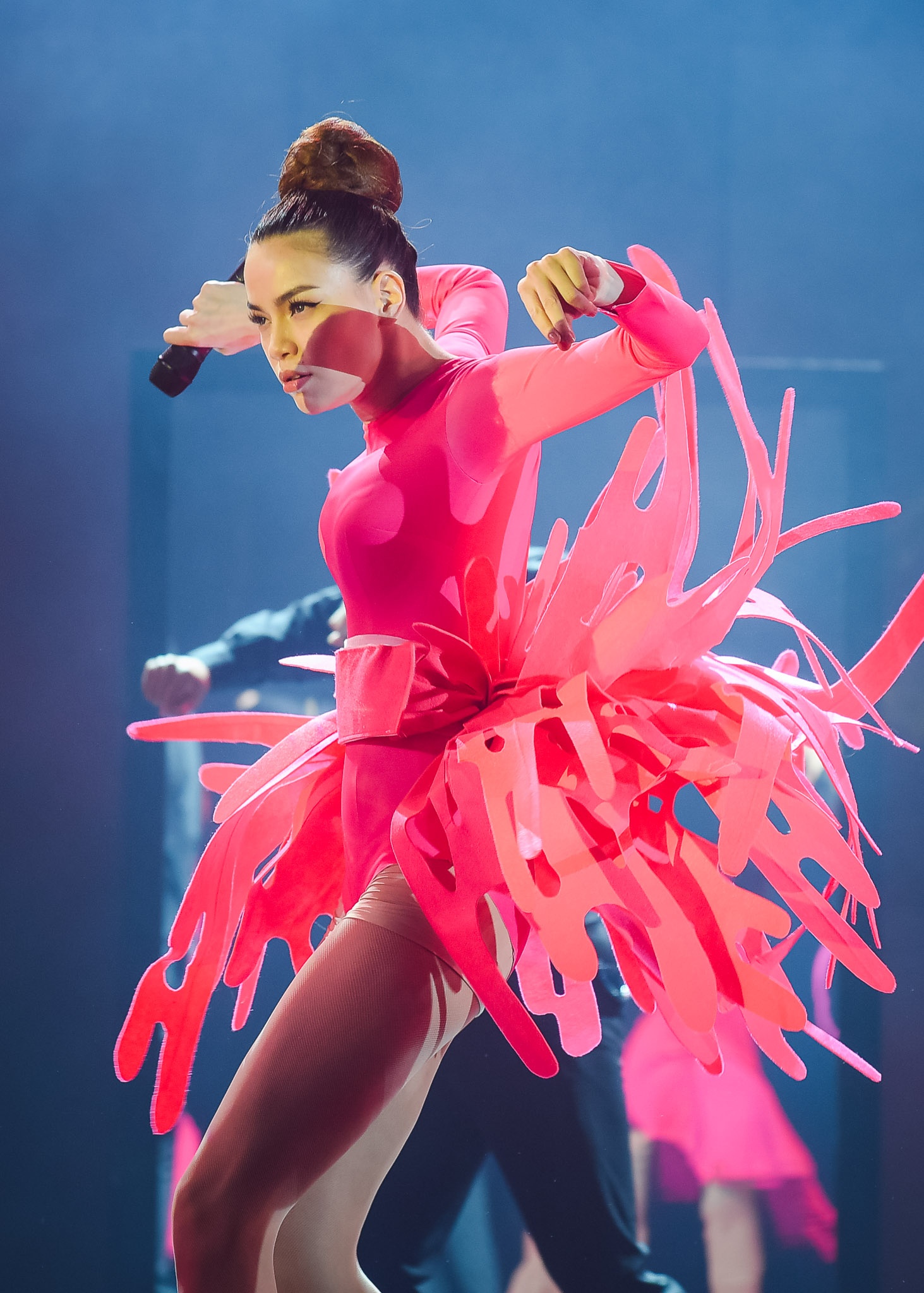 Hồ Ngọc Hà liên tục thay trang phục trên sân khấu khiến người xem không thể rời mắt. Phía dưới khán đài, người hâm mộ đứng dậy nhún nhảy theo từng giai điệu của liên khúc. |