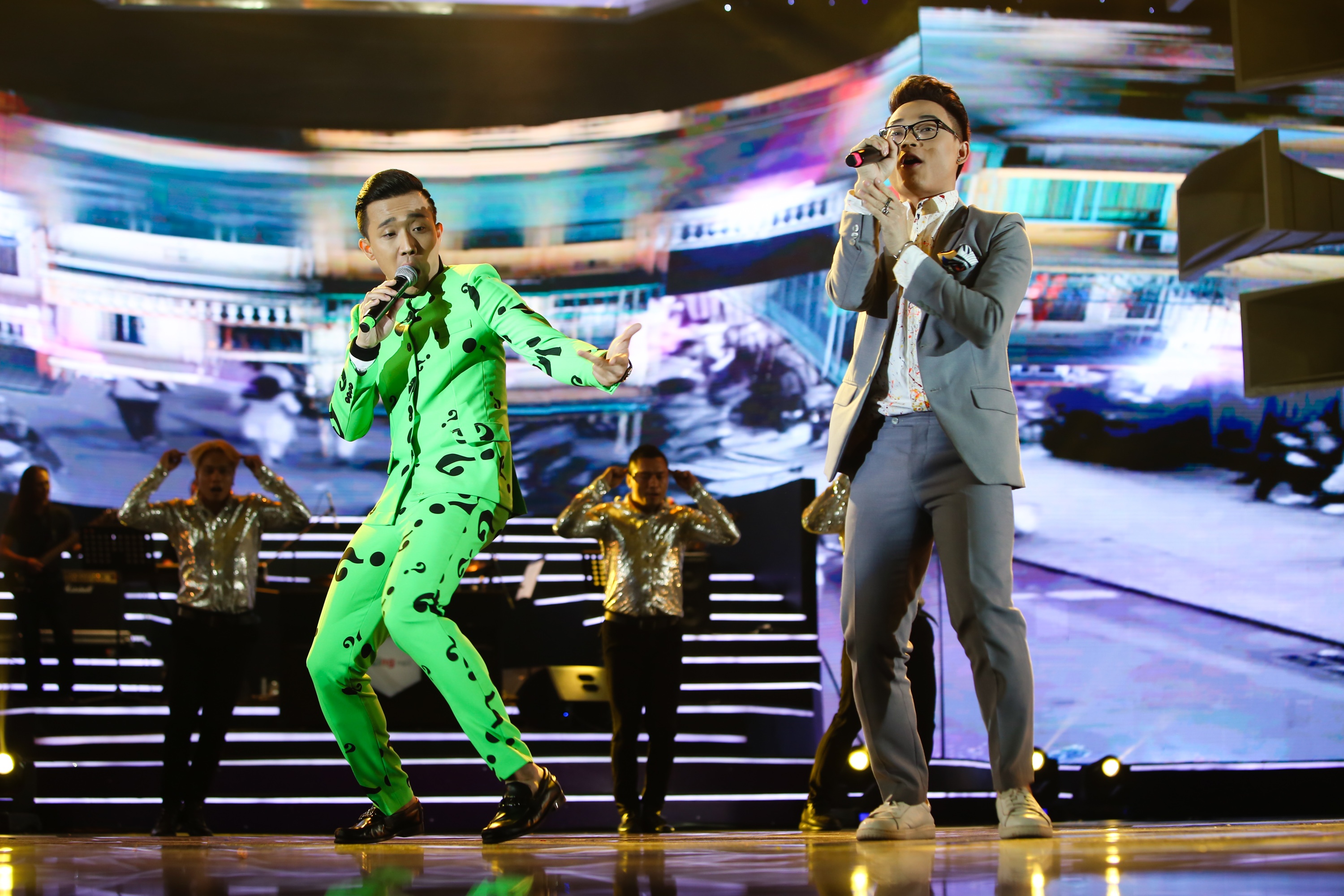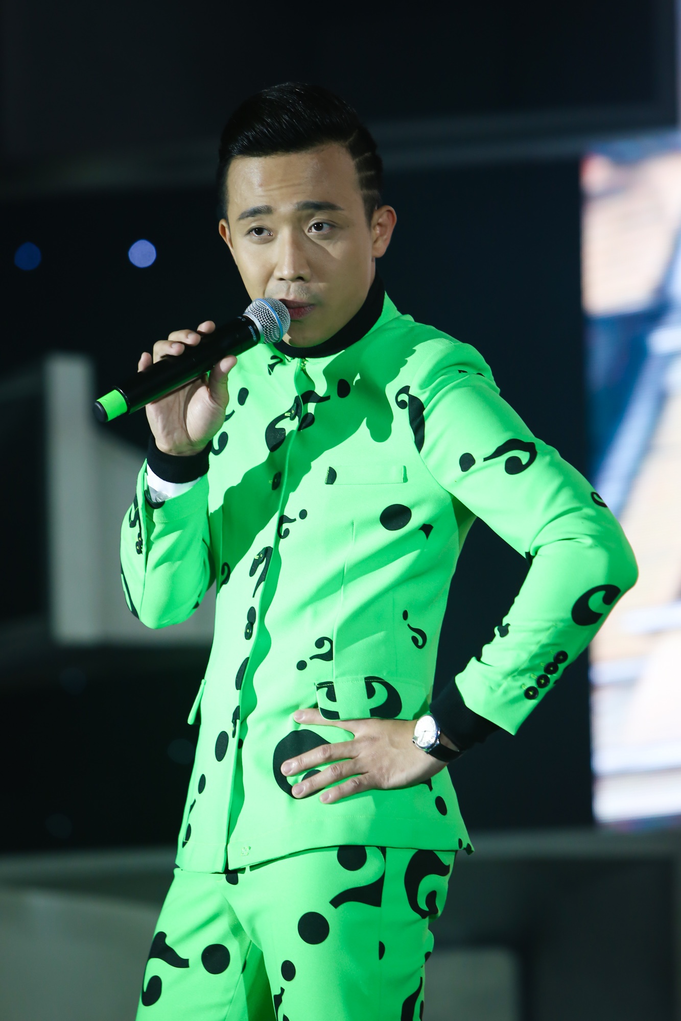 Trấn Thành bất ngờ song ca cùng Trúc Nhân trong ca khúc Thật bất ngờ. MC điển trai làm "chói mắt" người xem với trang phục màu xanh nổi bật và biểu diễn theo phong cách hài hước. |
