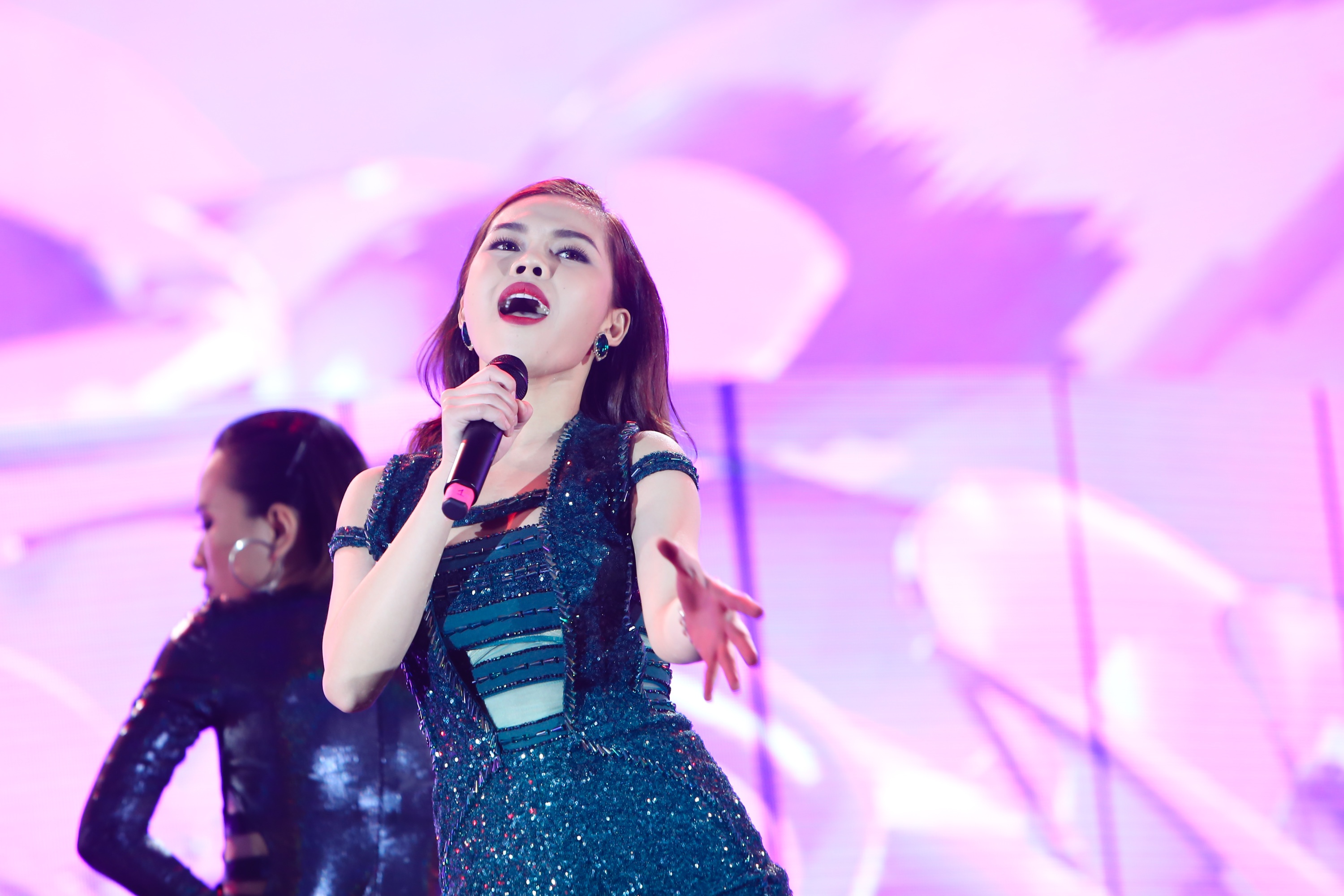 Những ca sĩ trẻ cũng không kém cạnh 2 bậc đàn chị khi mang đến những tiết mục "thiêu đốt" sân khấu bằng vẻ ngoài lôi cuốn, vũ đạo sexy và phần dàn dựng hoành tráng. Tóc Tiên thể hiện sáng tác của Hoàng Touliver - I'm In Love giúp cô phô diễn chất giọng khỏe khoắn và phong cách trình diễn cuốn hút. |