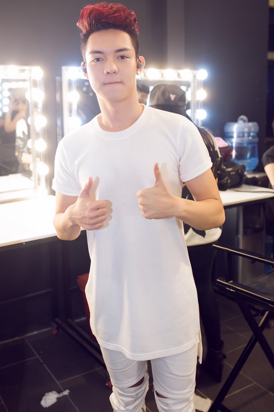 | Hot boy Nguyễn Duy thay đổi phong cách thời trang ở live show 3. Anh diện "cây trắng" cùng mốt tóc nhuộm đỏ cá tính. |