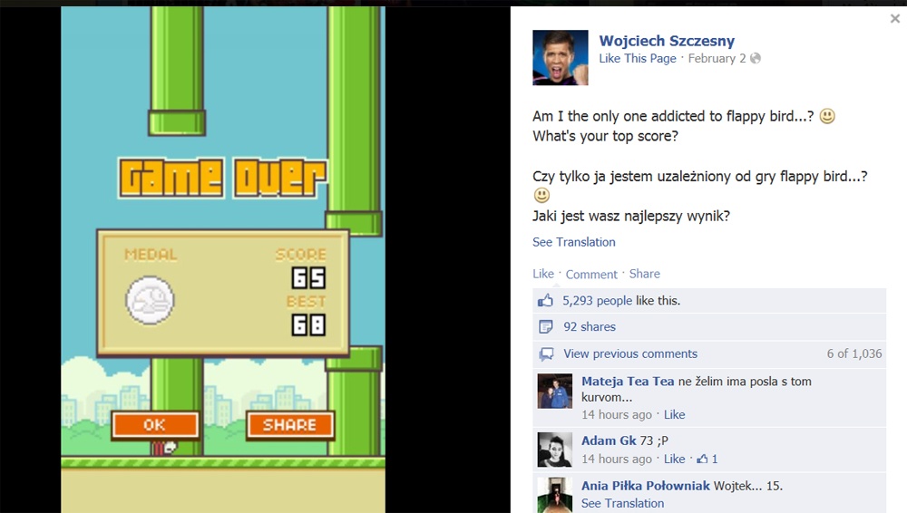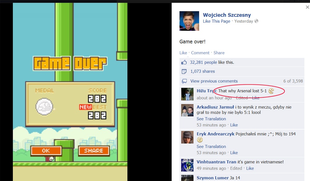 Dù thất bại trên sân cỏ nhưng Szczesny thực sự là cao thủ Flappy Bird khi anh đạt được số điểm kỷ lục lên tới 282. Đây là một thành tích “khủng” đối với trò chơi mới nổi này. Cách đó đúng 1 tuần, Szczesny cũng thừa nhận mình là một trong số rất nhiều người “nghiện” Flappy Bird và đã đạt được kỷ lục là 68 điểm.