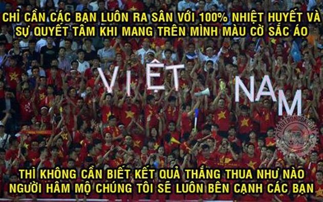 | Người hâm mộ không bận tâm tới kết quả trận đấu, họ luôn sẵn sàng sát cánh cùng đội tuyển nếu các cầu thủ ra sân với tinh thần thi đấu cao nhất. |