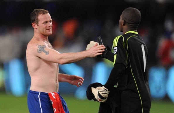 | Meyiwa từng có cơ hội so tài với Rooney trong trận giao hữu giữa Orlando Pirates với M.U vào tháng 7/2008 diễn ra tại Durban, Nam Phi. Ảnh: Getty Images. |