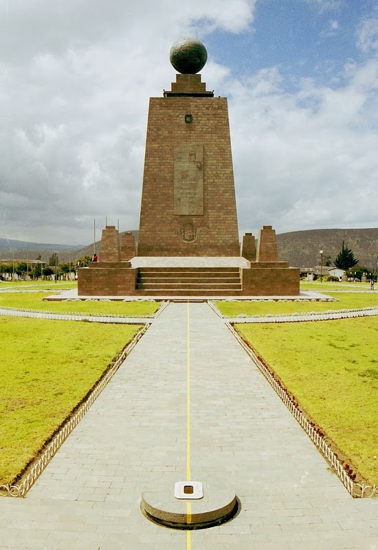 | Tượng đài nằm trong một công viên có tên gọi là "Mitad del Mundo" hay "Tâm của thế giới". Một đường màu vàng chạy trên mặt đất đó được cho là đánh dấu vị trí chính xác của đường xích đạo. |
