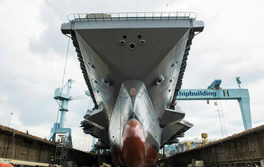 Ngày 7/5/2013, các chuyên gia đóng tàu đã hoàn thành 100 % phần cấu trúc tàu sân bay USS Gerald R. Ford. Hiện tại, con tàu đang được sơn các lớp sơn chống ăn mòn, lắp đặt chân vịt, hoàn tất hệ thống điện, điện tử, hệ thống neo và lắp đặt hệ thống radar tối tân, giúp nó đảm trách vai trò của siêu tàu sân bay đắt giá nhất hành tinh. Ảnh: gmw.cn.