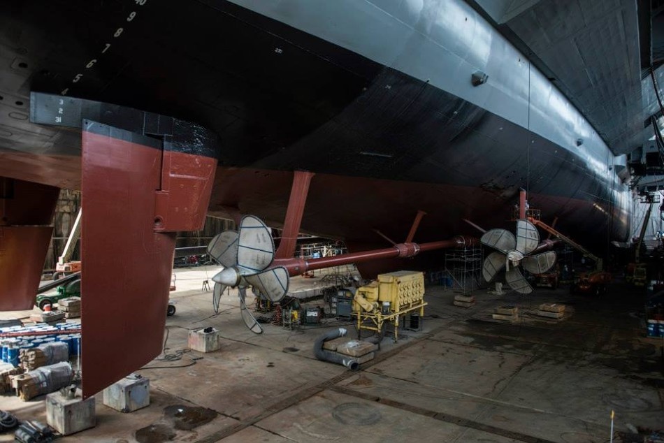 Hôm qua, tất cả 4 chân vịt của USS Gerald R. Ford đã được lắp đặt thành công, giúp hoàn thiện khả năng di chuyển của con tàu. Mỗi chân vịt gồm 5 cánh được đúc bằng đồng, có tổng trọng lượng lên tới 30 tấn. Các chân vịt và bánh lái khổng lồ giúp siêu tàu sân bay USS Gerald R. Ford di chuyển linh hoạt trên biển, bất chấp tải trọng khổng lồ của nó. Ảnh: gmw.cn.