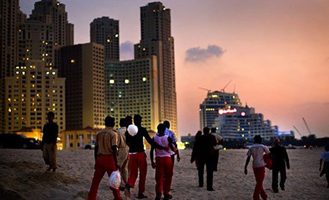 | Theo BBC, tốc độ tăng trưởng kinh tế và thị trường bất động sản của Dubai sẽ khó có thể đạt được con số ấn tượng như hiện nay nếu không có hàng triệu lao động chân tay gia nhập thị trường này. Họ thường làm việc theo ca bất kể ngày đêm để hoàn thành các công trình, nhưng chỉ được nhận mức lương chưa đầy 120 EUR/tháng. |